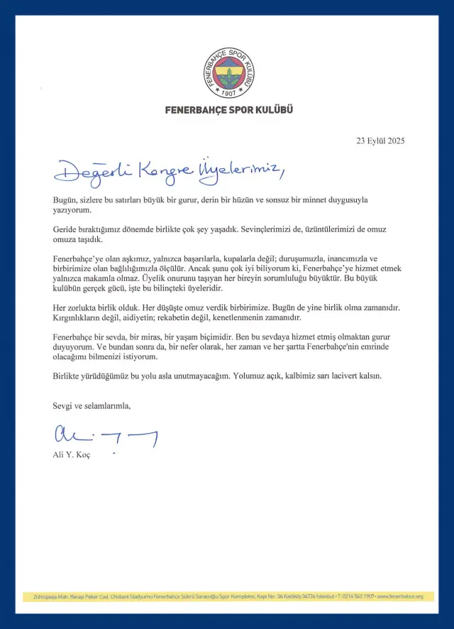 Öte yandan Ali Koç kongre üyelerine veda mektubu gönderdi. Koç’un mektubunda, “Bugün, sizlere bu satırları büyük bir gurur, derin bir hüzün ve sonsuz bir minnet duygusuyla yazıyorum. Geride bıraktığımız dönemde birlikte çok şey yaşadık. Sevinçlerimizi de, üzüntülerimizi de omuz omuza taşıdık.